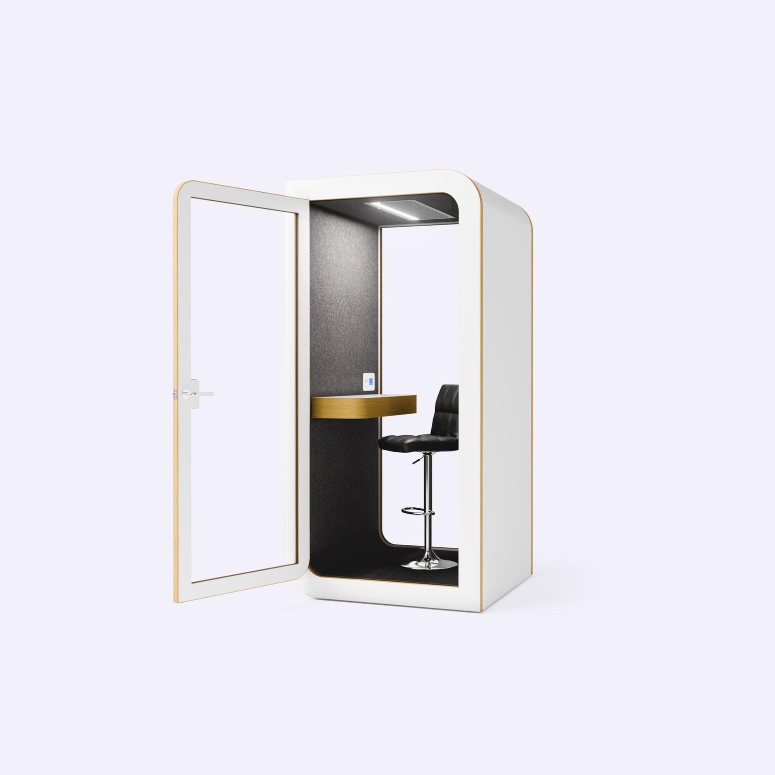 Les finitions sont soignées : panneaux en chêne clair ou anthracite, moquette acoustique au sol, prise électrique et port USB intégrés. L'éclairage LED est réglable en intensité, un détail appréciable pour les visioconférences où la qualité d'image compte.
